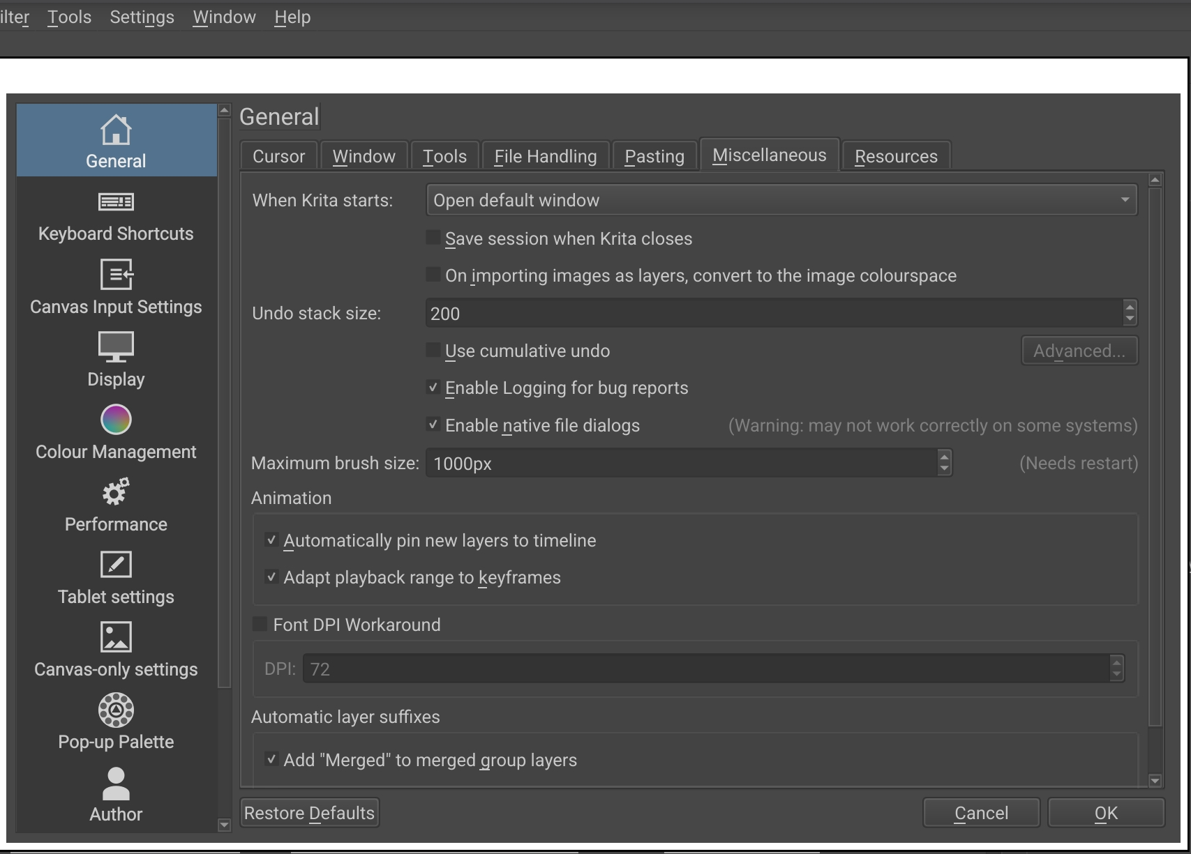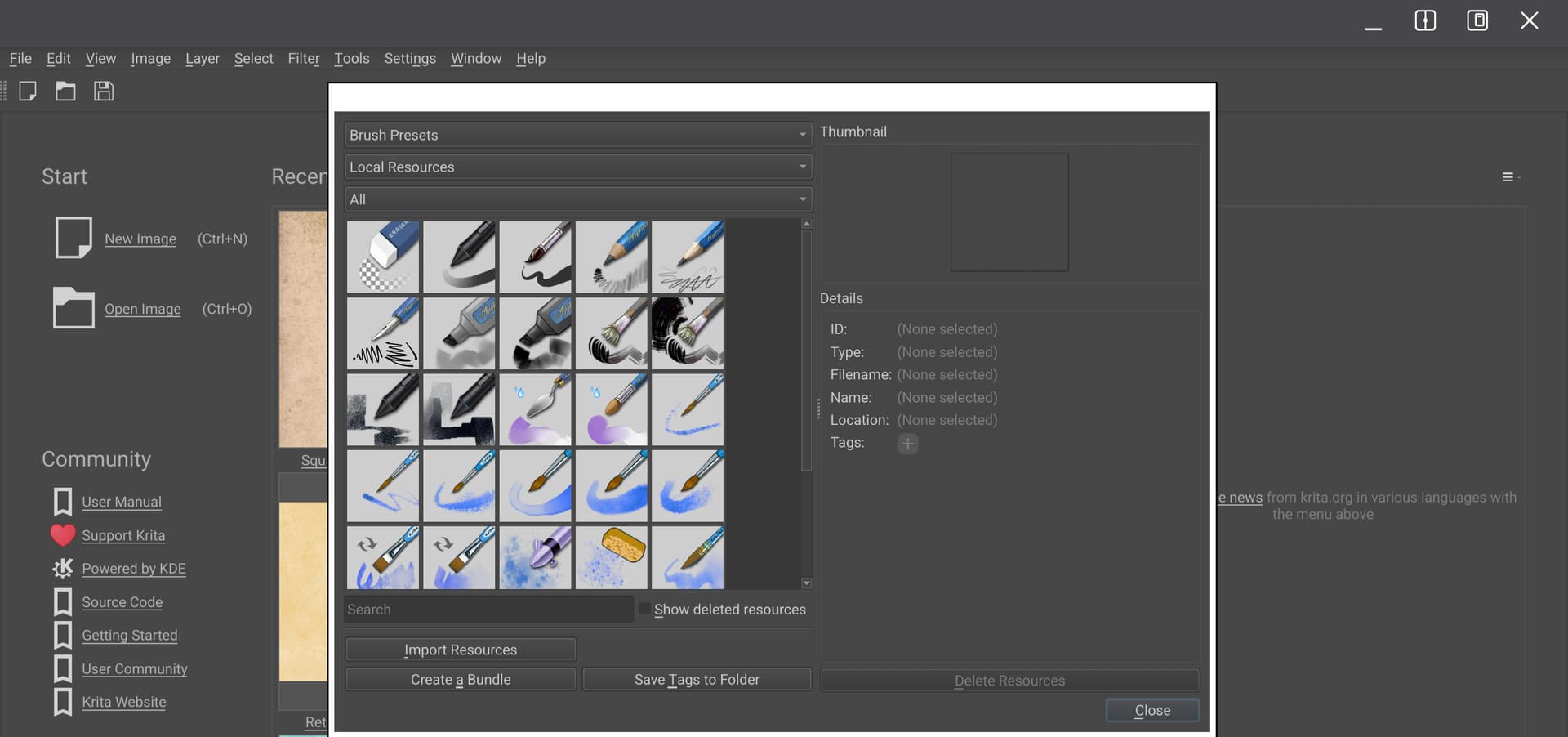 Now, with Krita opened the & settings > manage resources is as below, I cannot see a button saying ‘Open Resource Folder’, it looks like below here;