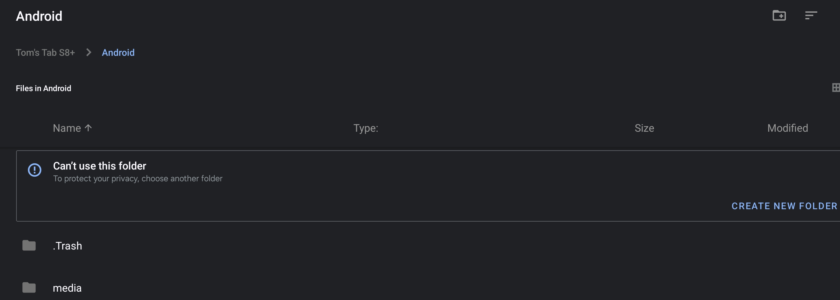 I’m given option of ‘create a new folder’ & can see ‘.Trash’ & ‘media’ folders, nothing else.