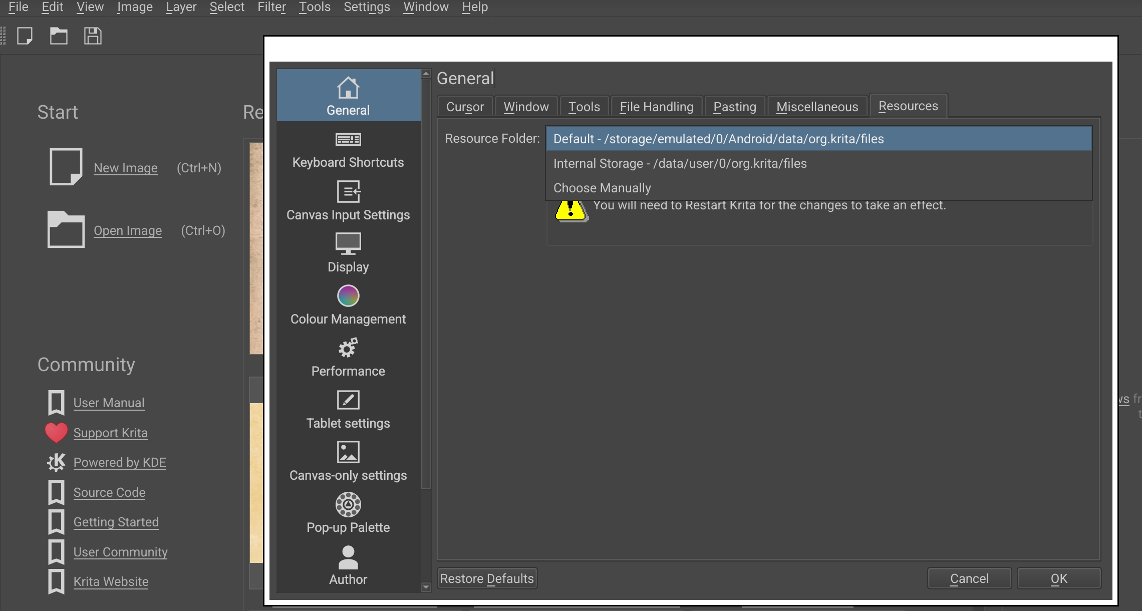 Do I need a clean install & to specify manually somewhere accessible on my tablet for Krita to accept files from in resources?