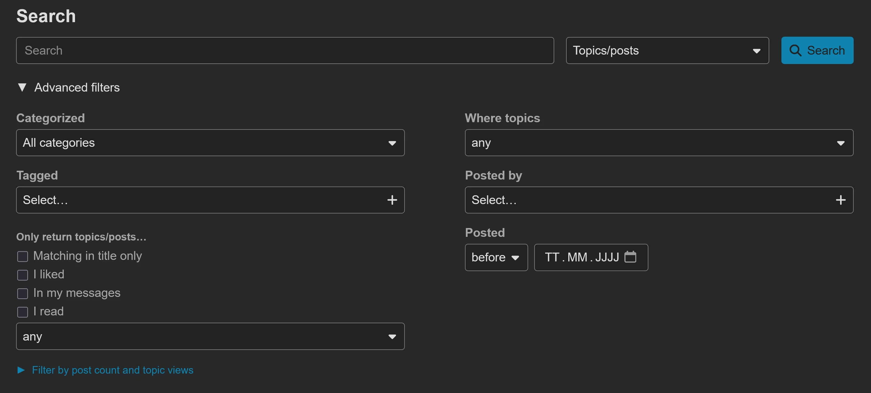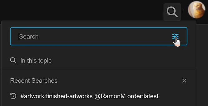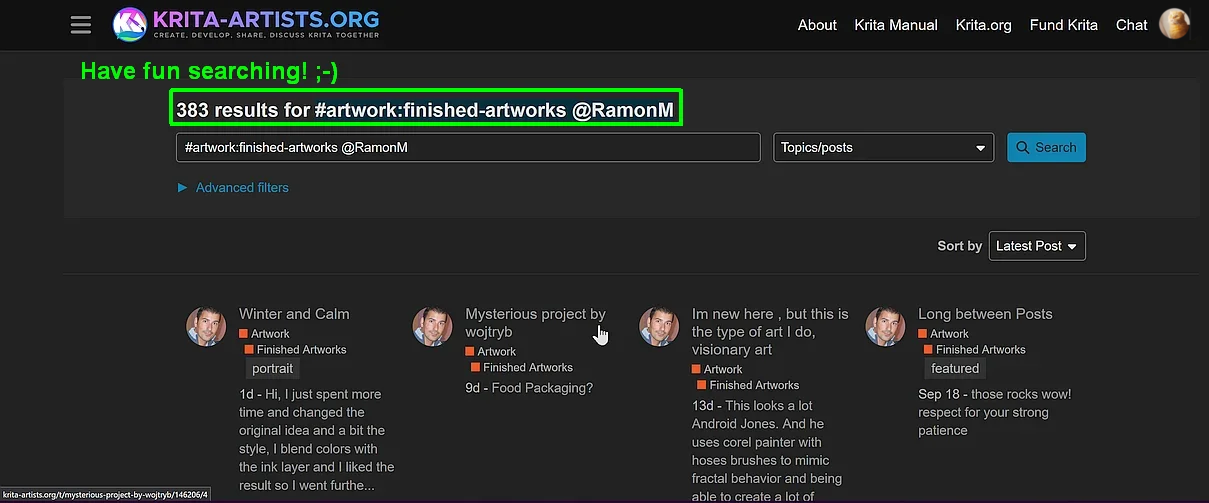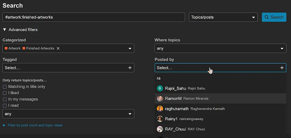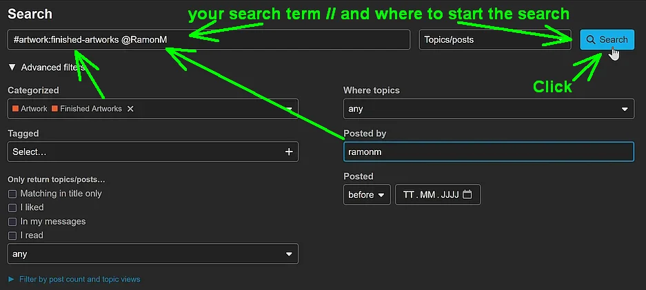 Search Box ↓Advanced Search where you then, with a click on their blue text, open the Advanced filtersCategorized, you select the category where to search in, by the way, Artwork Finished Artworks would be a good bet,Posted by, where you have to search for the user in question, simply enter the first few letters of their username into the search box and click on the users name when found, ↓Michelist