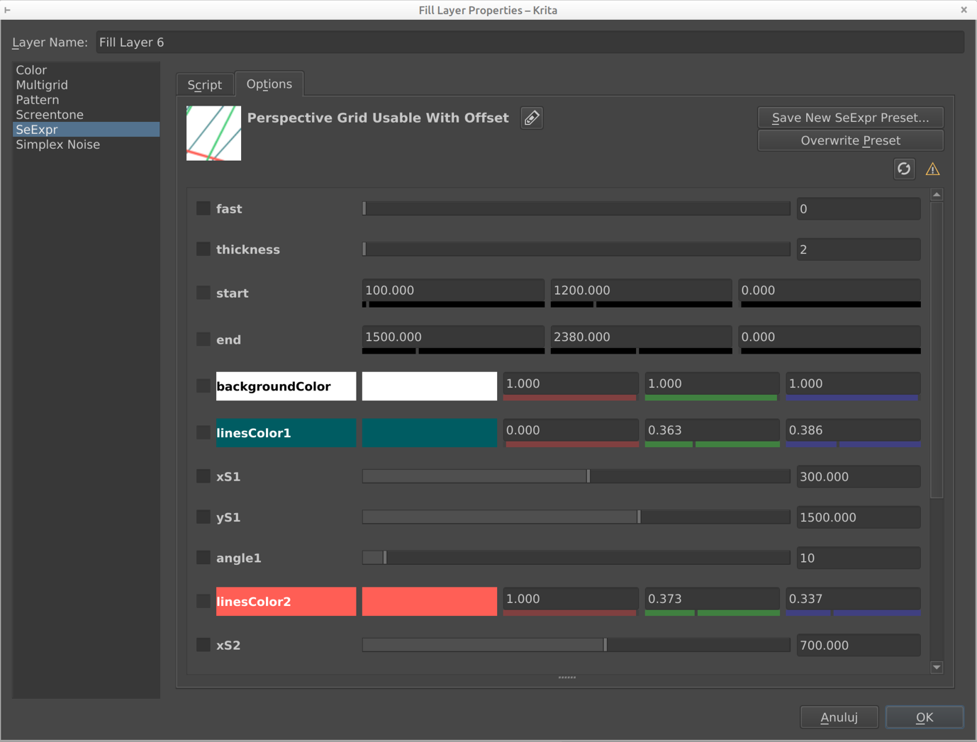 Hi, I am working on a SeExpr scripts bundle. I’m going to make several grids, I already have standard grid (define the grid by pixels), divided grid (by default: “rule of thirds” grid, but it doesn’t need to be divided into three sections), phi grid (“rule of thirds” but with the golden ratio), and I recently coded the 3-point perspective grid as well.
