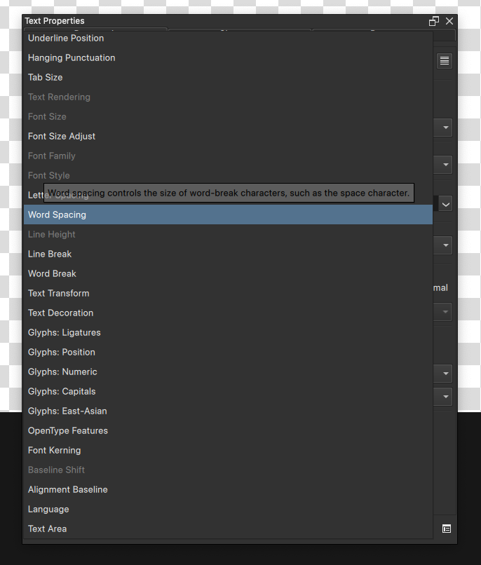 It’s intentional. You can configure it in the button next to the add property dropdown. The reason it was done this way is because there’s a lot of text properties, and depending on the script, language or even the kind of text needs you have, different kind of properties take center stage. I wanted to allow people to only have the properties they care about be visible at all times.
