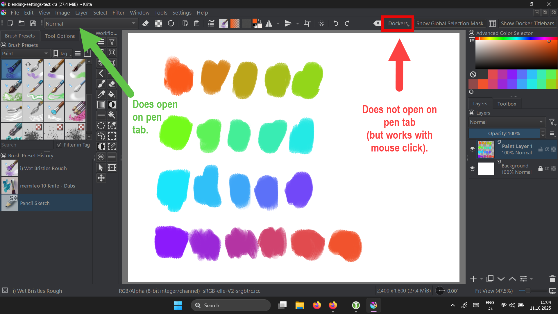Unfortunately it does not open on pen tab (but works with mouse click). The “blend mode” dropdown button works though.