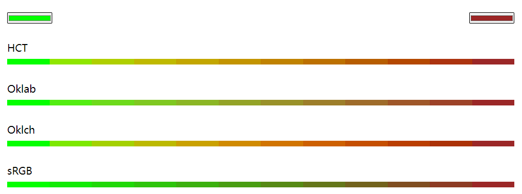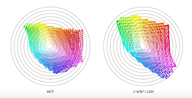 I learned that Google has launched a color space called “HCT” not long ago. From the comparison chart, its color transition is even better than the previously described oklab, and closer to the realistic paint.