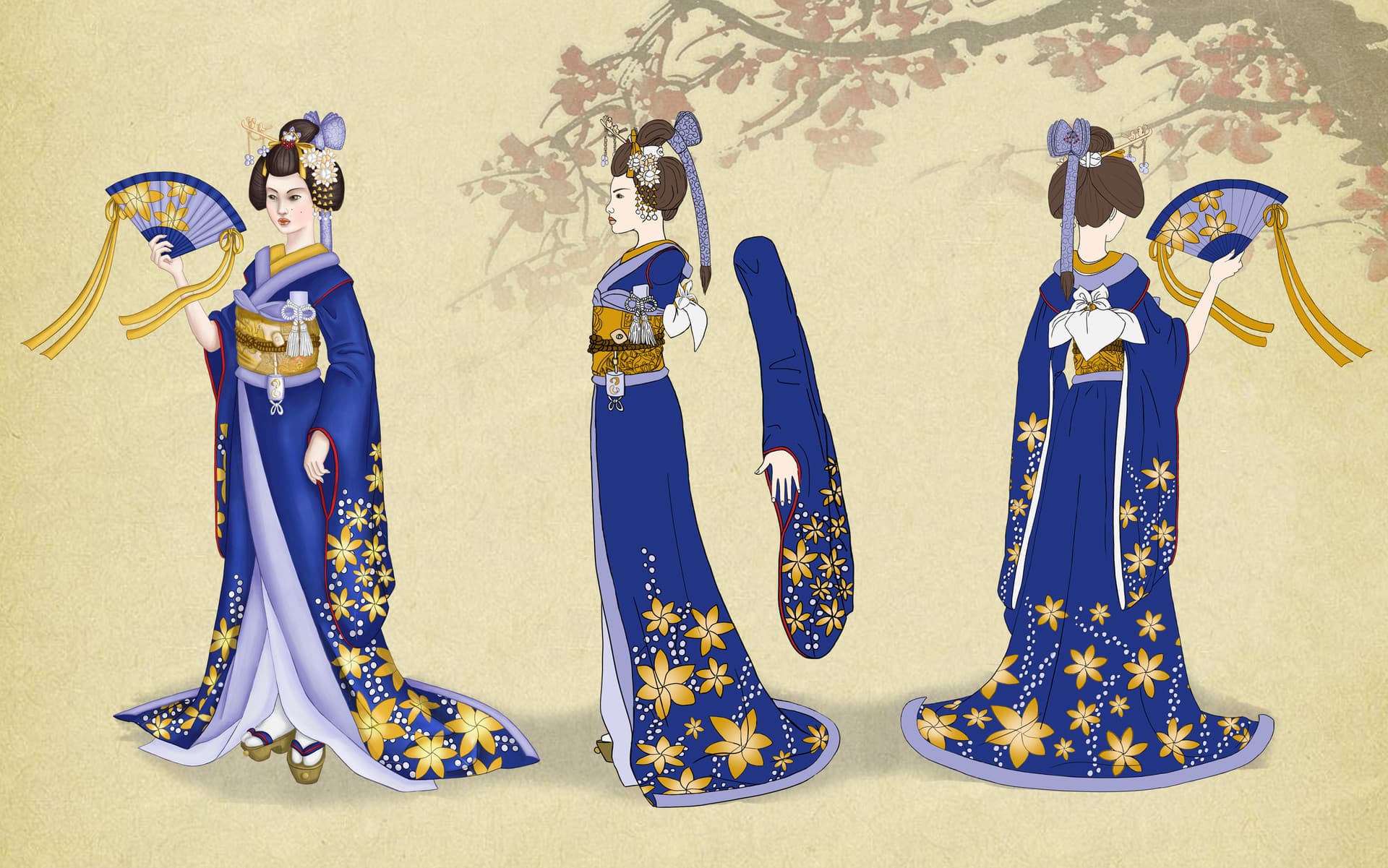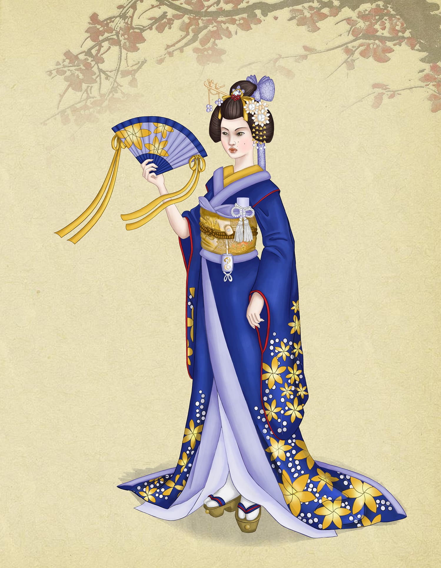 Her outfit is a combination of the Shiromuku (a kimono that used to be worn for weddings in samurai families) and the ceremonial kimono that is still worn today during holidays and formal events. The golden flowers it is embellished with are the girl’s favourite flowers that grow near her temple.