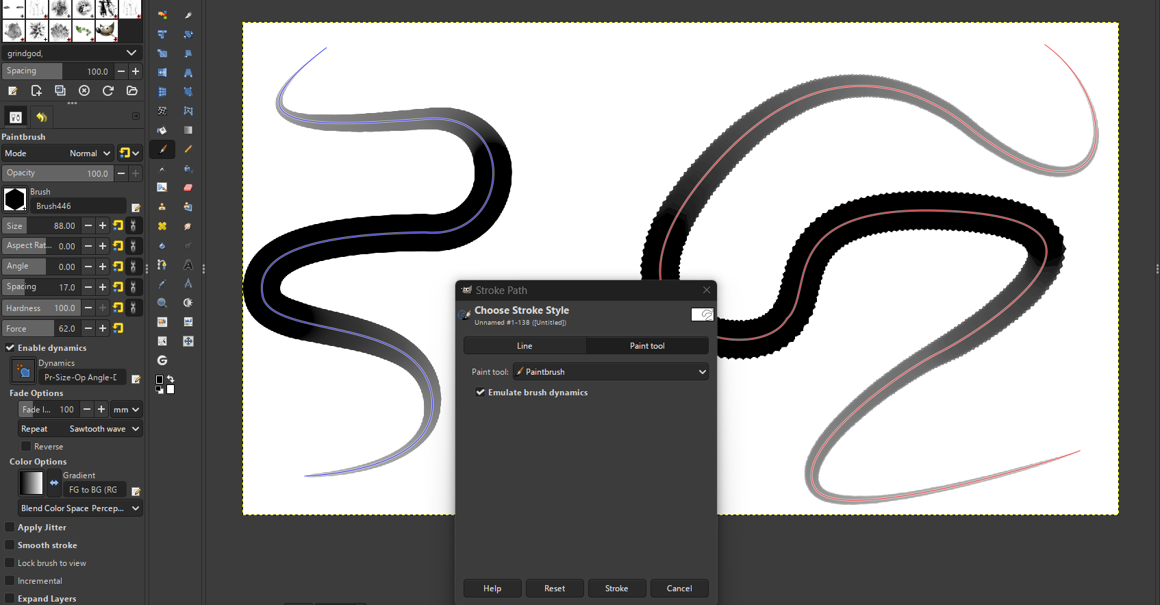 So as I also have GIMP3.0 on my computer, I researched there “Paths Tool”. The stroke operation has a option to check, that will allow you to emulate the brush selected (below), though with GIMP, you have to enable the “Brush Dynamics” in Tool Options for desired effects.