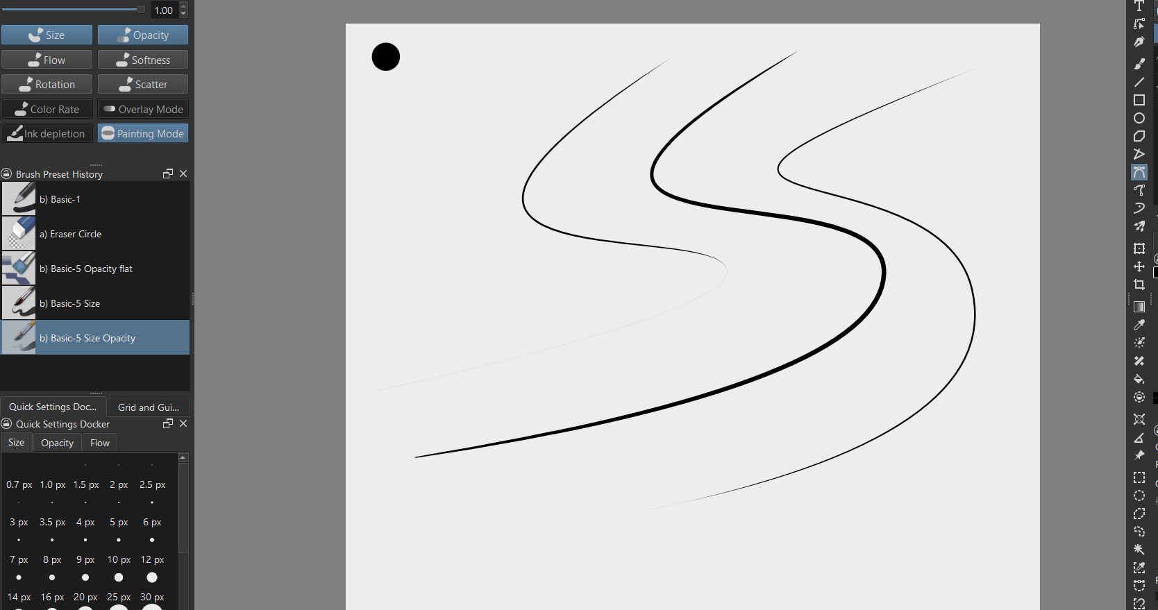 I have found that, if in a Paint Layer and a brush like “b) Basic-5 Size” is chosen, by changing your size sensor to “Fade”, using the upside down “U” setting and adjusting the length can give you a tapered end on both sides. This being said, it takes a lot of tries to get the line to the desired taper and when you adjust the size of the brush, you once again have to adjust the “length”. BTW, with this process, the width of the brush is not what it is set brush size either, usually closer to 1/4th the width or narrower. Below shows the b) Basic-5 Size-Opacity @83 px, the dot is the basic round @80 px