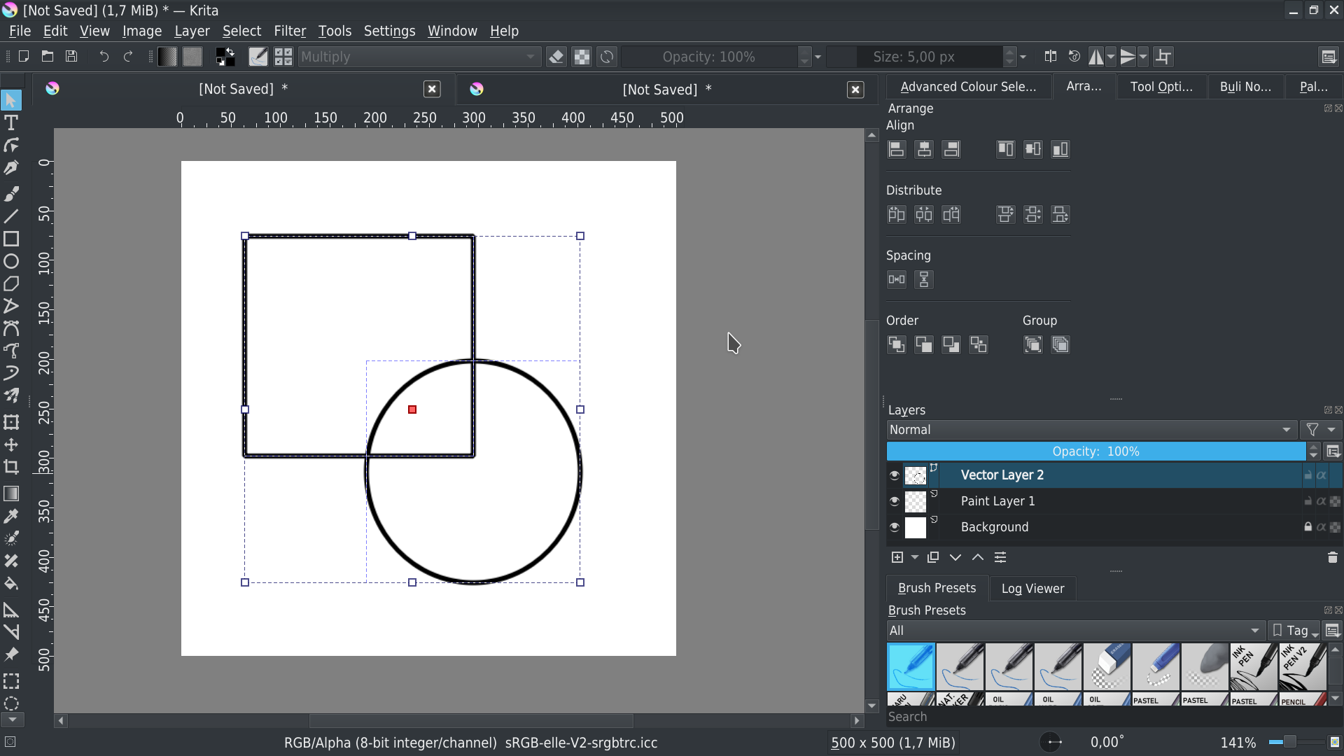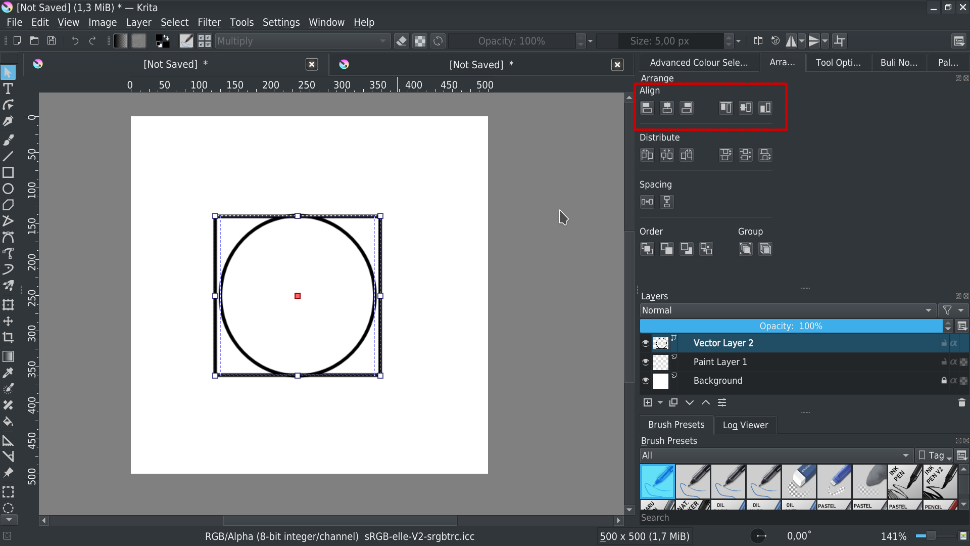 Alignment tools are available for vector shapes through “Arrange” docker.