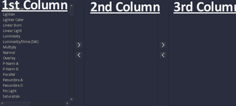 you would pick (from all the blend modes (area not shown in picture) the ones you want to go in a prefered column. and maybe have the ability to add dividers like this