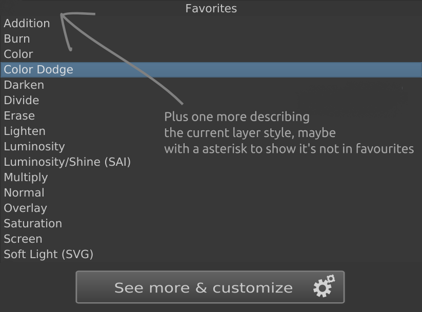 EDIT: @tiar I might put the [see more & customize area] button to the right of the Normal blend mode. And prevent normal from being removed from the main favorite tag.