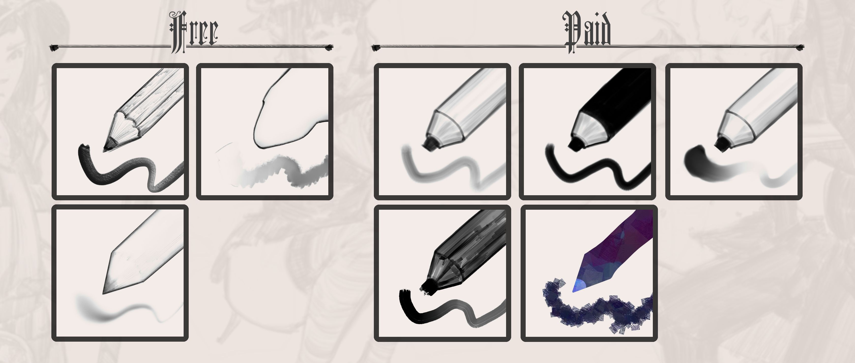 I’ll put all the brushes I use the most in the free version and only put stuff with more specific use cases in the paid one in the future, though I’m slow, kinda lazy, and am only consistently inconsistent, sooo it might take a while till I update anything d===( ̄▽ ̄*)b