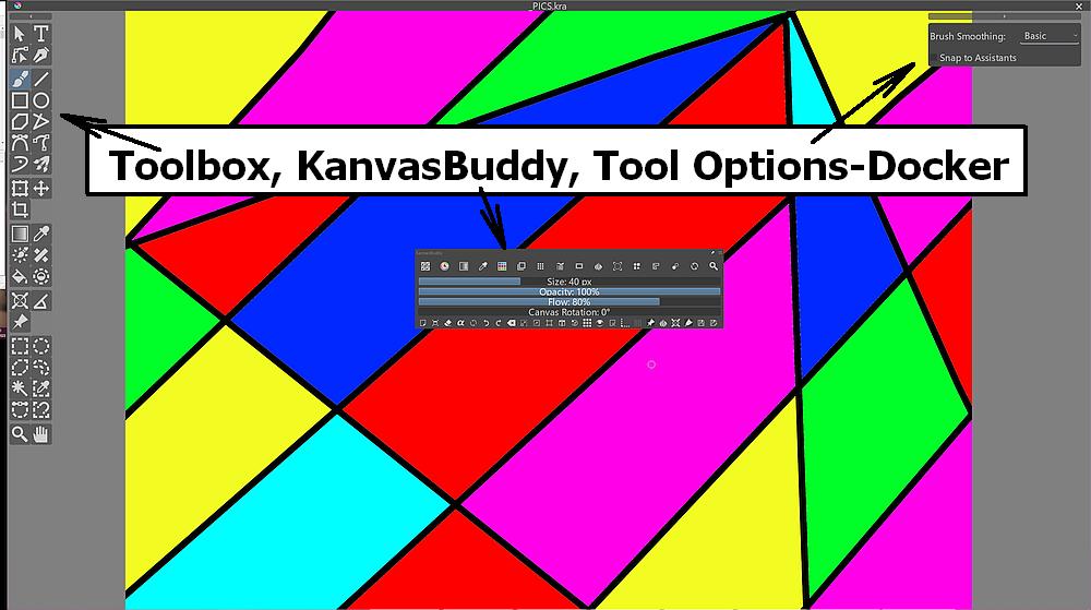 This screenshot shows how the redesign plugin puts Toolbox and Tool Options docker into the canvas, furthermore you see in the middle the free floating window of KanvasBuddy in a maximum configuration that has all inbuilt options enabled (even that can be extended manipulating a JSON-File if you have a little coding experience):