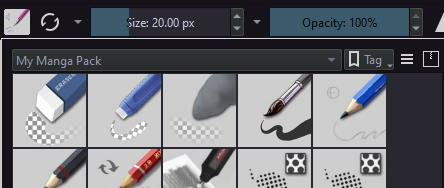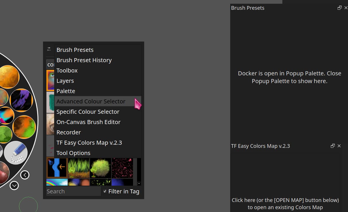 With brush presets chosen, you can see that the brush presets docker itself changes to be empty … I tested closing that docker and it had no effect on being able to use the pop-up palette method of accessing brush presets, so this could be a great way to have a lot of screen space and be able to have dockers not showing on-screen unless you bring them up via the pop-up palette shortcut.