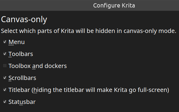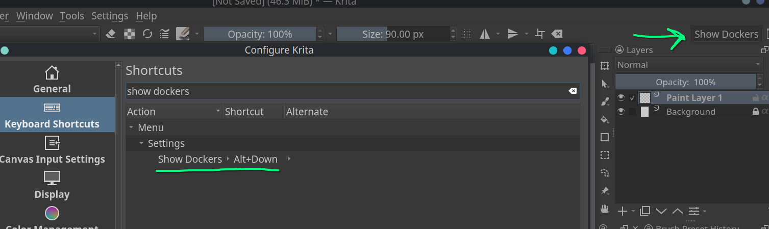 And The canvas should be resized every time you hide and show the docker, since some tools require full canvas preview. You should add an an option in settings that shows these arrows at docker borders . The canvas only mode is good but this feature would be a good addition.