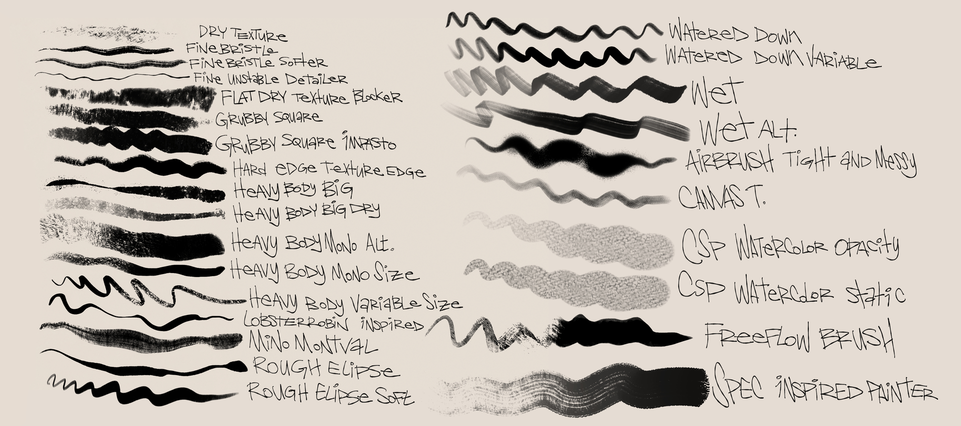 Hello everyone! I’ve returned with another brush pack for Krita, this time I was inspired by the look and feel of acrylic/gouache paints. Much like my other packs, expect messy shapes and grungy textures. Also included are two hacky interpretations of CSP’s’ watercolor brush which are well suited for textural glazes, but don’t work all that well over a large surface area.
