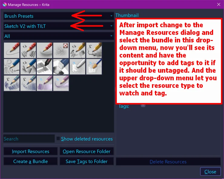 After import change to the Manage Resources dialog and select the bundle in the second drop-down menu, now you’ll see its content and have the opportunity to add tags to it if it should be untagged. And the upper drop-down menu let you select the resource type to watch and tag.