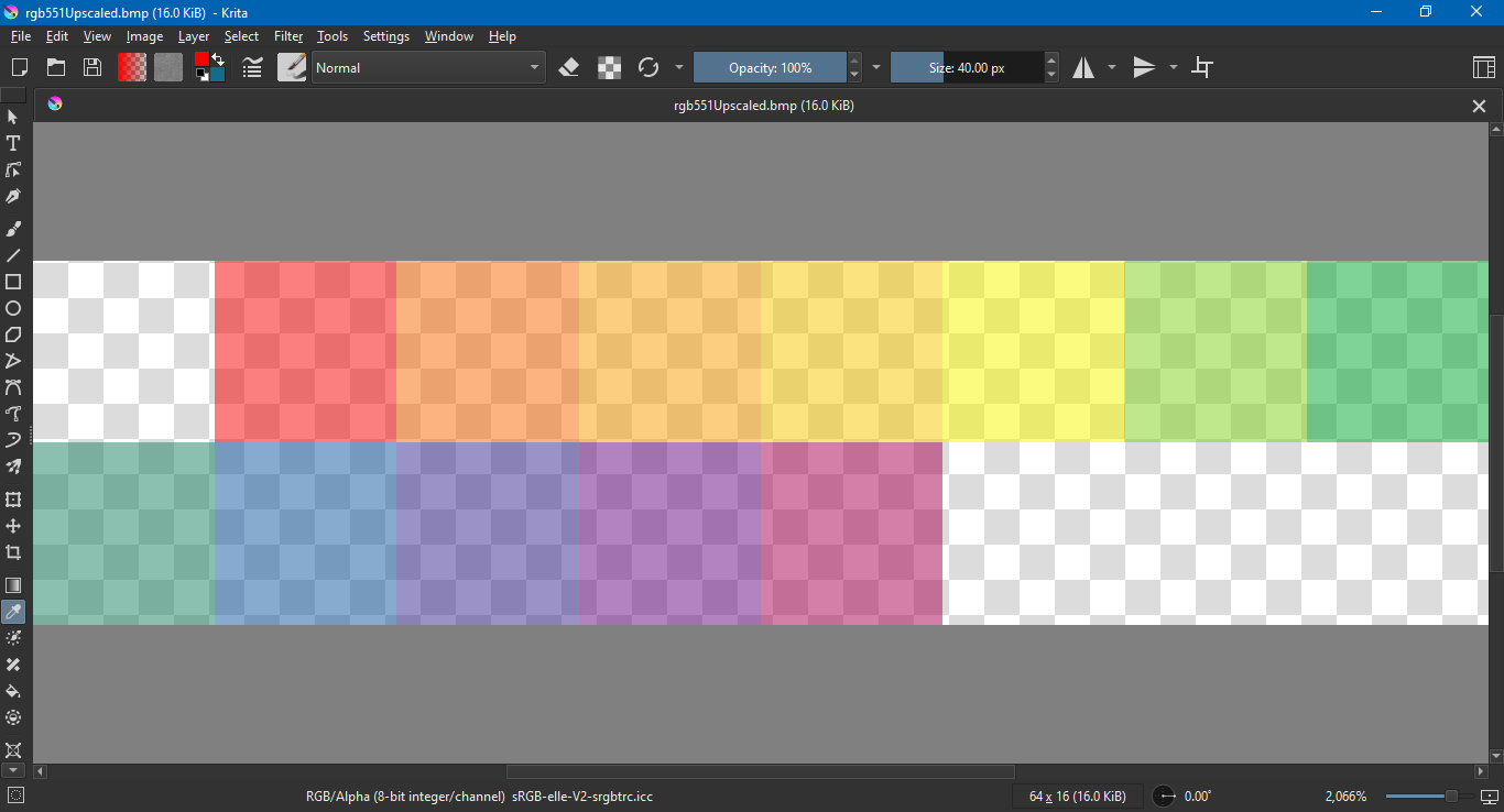 I’m posting this as a preliminary to see if this is a bug with Krita’s bmp import or with the export that generated the bmp. An RGBA5551 format bmp opens as translucent in Krita. I’m using Krita version 5.2.3 on Windows 10.
