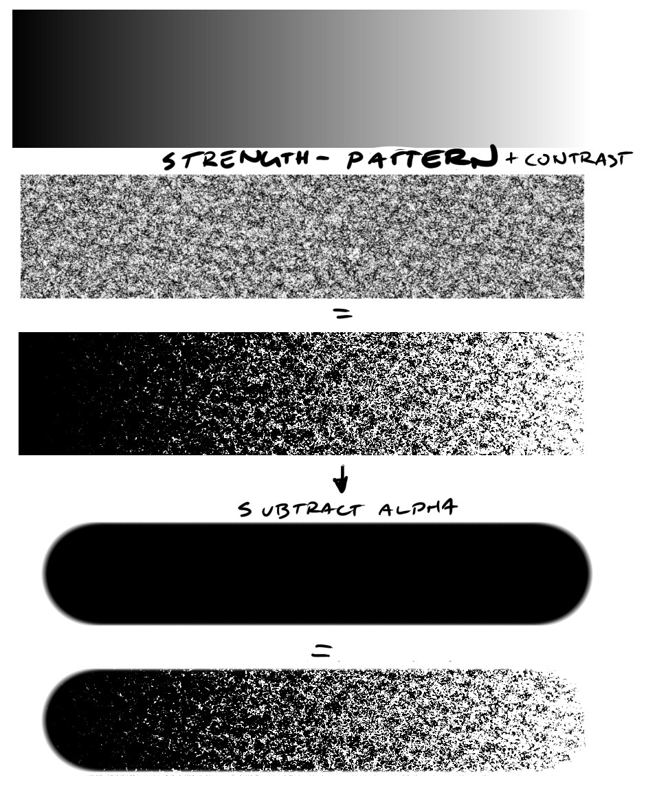 So we calculate [ strength ] - [ pattern ] and then increase the contrast of the result considerably. One way to do this would be to just multiply the result by e.g. 1000, assuming the result is clipped to 8-bit color range. (a bit ugly, I know.)