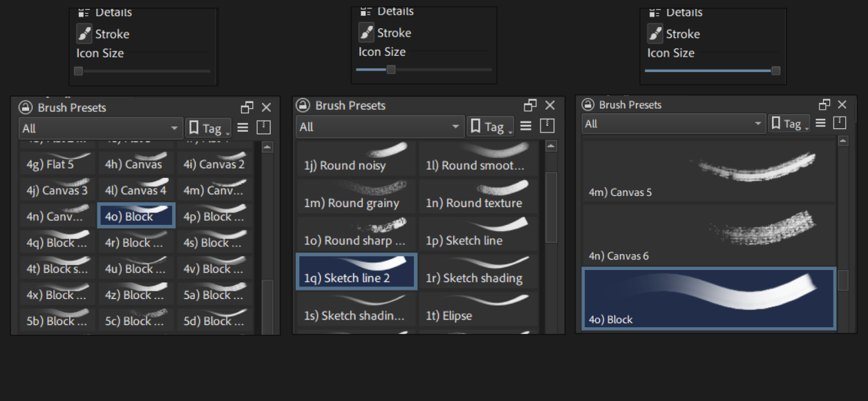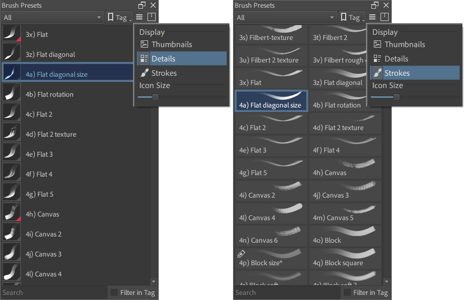 I chose to stick an approach similar to Photoshop for simplicity, you can still hover over brushes to see their icon or look in the brush editor.