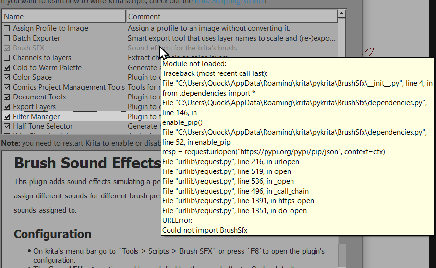 EDIT: just tried running latest nightly, but offline, to see if brushSfx wouldn’t try to do anything different to how it used to work, and if it would work, but unfortunately it still doesn’t. Maybe this points to something in the latest nightly? but still need to say that basically I don’t run plugins that ping online or run downloads when open krita. Not being tech-minded, I’m crossing my fingers it isn’t an internal krita thing, where it’s krita pinging online checking every plugin? Don’t know of any such changes, but am rarely online/on the forum. Didn’t see any other plugins checked though, so am thinking that isn’t happening. Hopefully something in the text below can be helpful? Can’t do further tests, as doing this test has broken current install and needing backup to restore things!