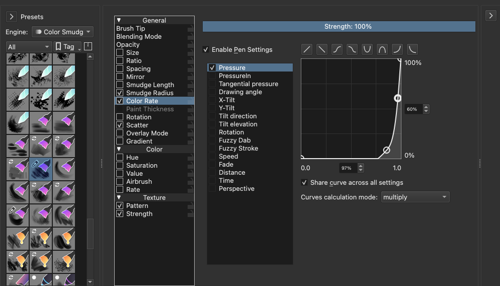 But you may have to experiment with this setting. Another option to enable is “smudge length”: also set this to 100% and pressure. I have my curve set up like this: