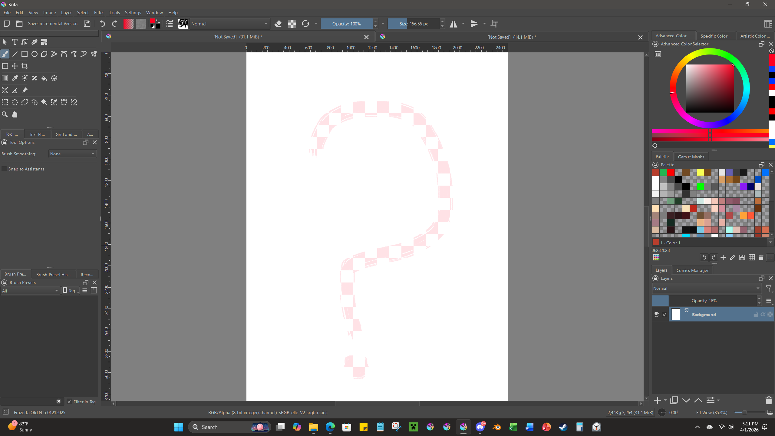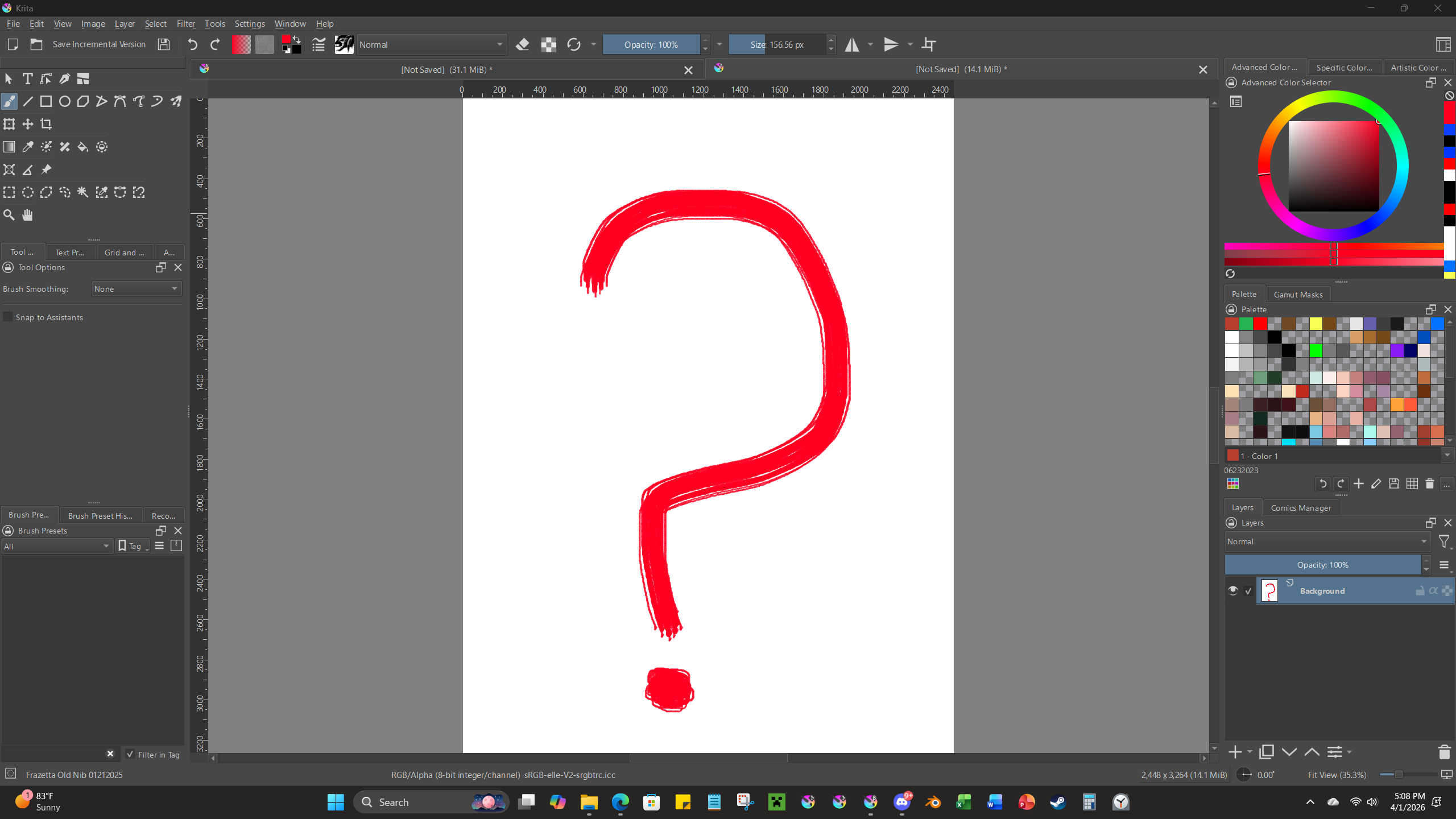 This is my first document. You can see that I’ve lowered the opacity of the background layer and, for whatever reason, the red question mark on my second tab is showing up through it.