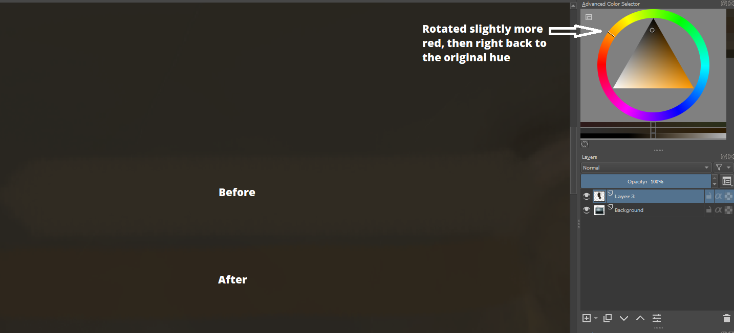 I believe I have found a bug with the advanced color selector. When painting in a 16 bit color space, after picking a color and rotating the hue, the luminosity/value/intensity isn’t preserved and the color actually gets darker.