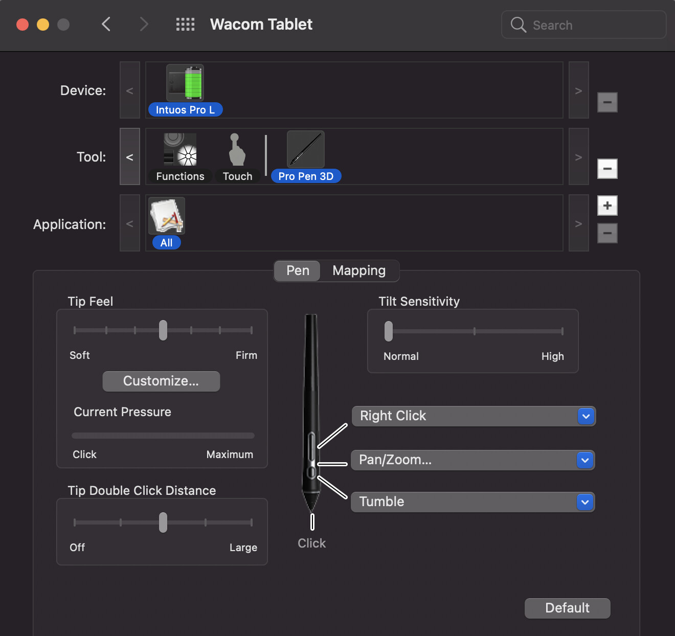 Below is what the pen settings look like with the latest drivers. I’m using the middle button labelled “Pan/Zoom”.