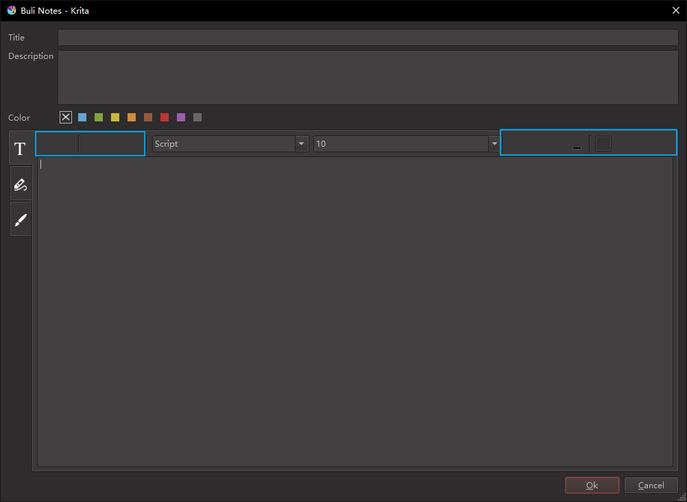 C:\Users\arjen\AppData\Roaming\krita\pykrita\bulinotes\bn\bnnotes.py in init(self=<bulinotes.bn.bnnotes.BNNoteEditor object>, note=<BNNote({2ab2878b-44da-4237-9641-f130c2b066cb}, testing note, False, False, False)>, name=‘Buli Notes’, parent=None)