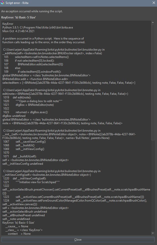 File “C:\Users\arjen\AppData\Roaming\krita\pykrita\bulinotes\bn\bnuidocker.py”, line 107, in __editNote