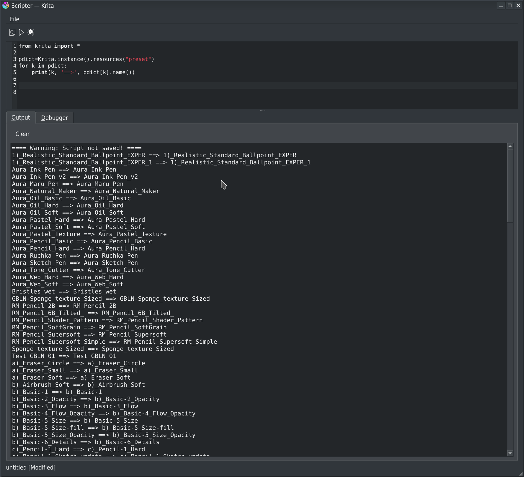 File "C:\Users\arjen\AppData\Roaming\krita\pykrita\bulinotes\bn\bnbrush.py", line 127, in getPreset