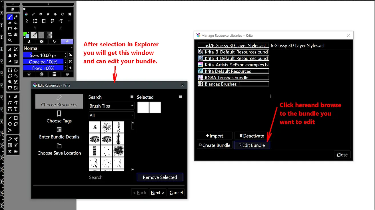 If I want to add or remove resources, then I unpack the bundle in question into a Krita installation I have reserved and prepared only for this, via another user-account on Windows. But this can be done with help of a second resource-folder too. Just tell Krita to use the other resource-folder.