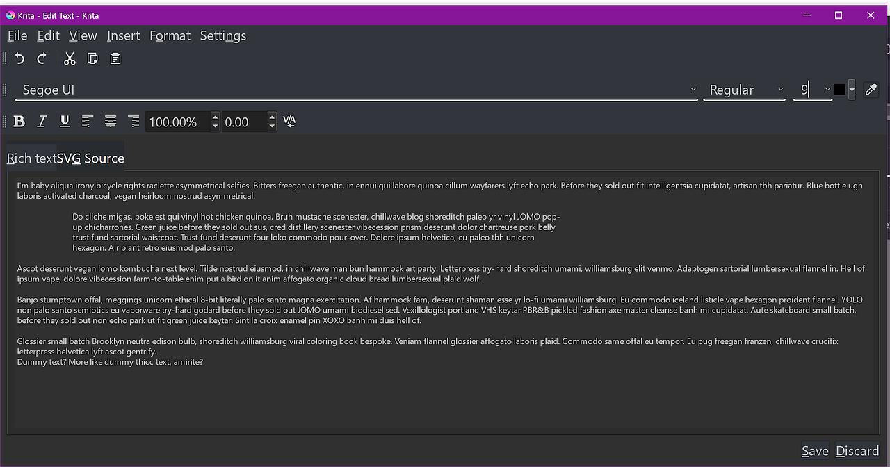 You have to design a text in the editor to meet your needs, all the formatting has to be “right” there at the latest! I would always create a larger text for use in Krita in a word processor first, then copy and paste that text into Krita’s text tool (or the plugin presented at the end ↓).