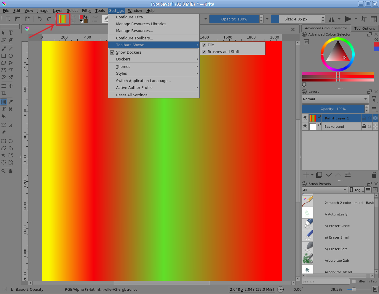 For some reason I can’t make a gradient using the gradient tool - that is, nothing appears when I drag it across the canvas. I tried deselecting all, resetting krita and reopening the document I was working on, opening up a brand new document, and making sure I was using a compatible brush and not a shape brush when I make a gradient, but nothing seems to work. It looks like krita is registering the fact that I am using the gradient tool though, since whenever I try to use it the paint layer refreshes and my color history updates when I choose a different colour to make the gradient. But no matter what, nothing appears and the layer remains fully transparent/no pixels are made at all. Oh, and I’m making sure that the brush I’m using isn’t on eraser mode (which it shouldn’t be even if I open up a brand new file to work on).