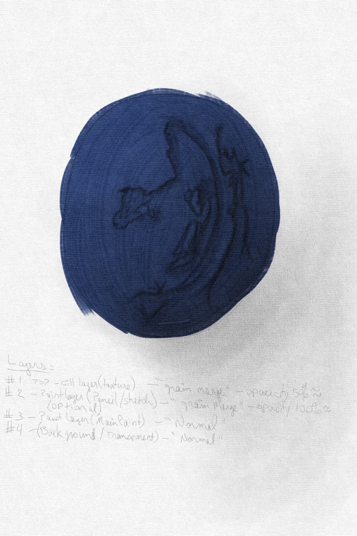 This 3rd layer is my main paint layer (left as “normal”). For this particular use (with the pencil layer) I only really need to use one color pick for each region as the shading in the pencil layer (merged with the canvas texture) gets merged with the color here. The outlines then take on the color instead of being pencil black/gray with color inside the shape, while still carrying down the texture from the canvas.