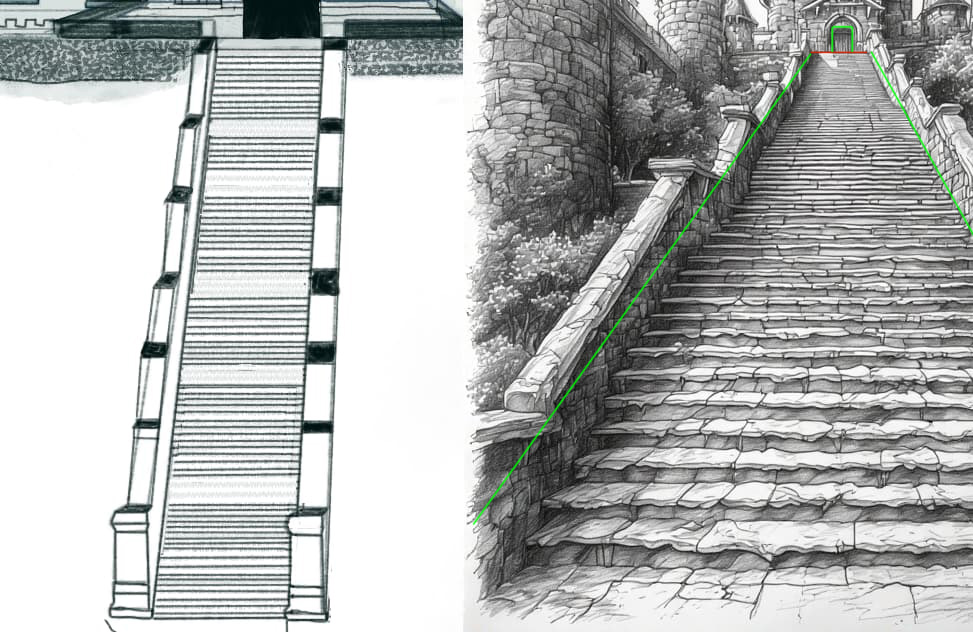 Also, in the reference, the door at the top is cut off at the bottom. You can’t see the top landing or the bottom of the door at all. This indicates you’re at the bottom looking up. In your drawing, since you can see the top landing it appears as if you’re looking at the stairs from up in the sky rather then on the ground below.