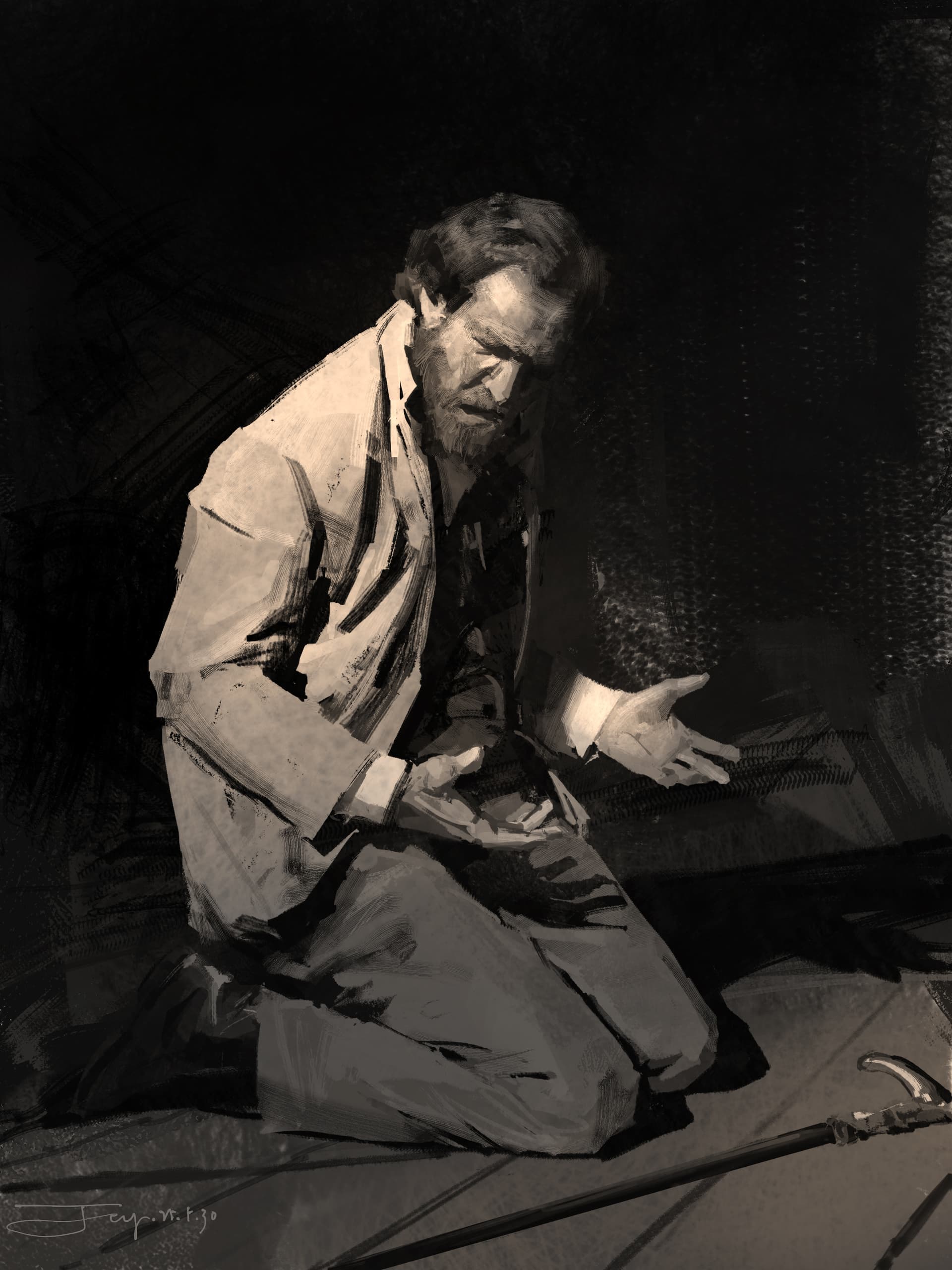 This is a quick sketching exercise, which takes about two hours. When I was browsing on pinterest, I saw an unknown photo. The man in the photo seemed to be performing a scene of emotional breakdown in a play. His expression and body language touched me, so I drew this sketch with him as a reference. I attempted to express a strong light and shadow effect by first dividing the picture into very few distinct layers of black, white and gray. The brushstrokes were also used very forcefully, in this way to convey the intense emotions of the characters.