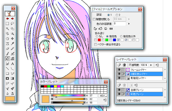 Then make a separate layer to fill the regions. Use the fill tool and select as reference color labeled layers and the color labels you used for highlights or shadows or both, and also the color label for the lineart layer. Then use the fill tool.