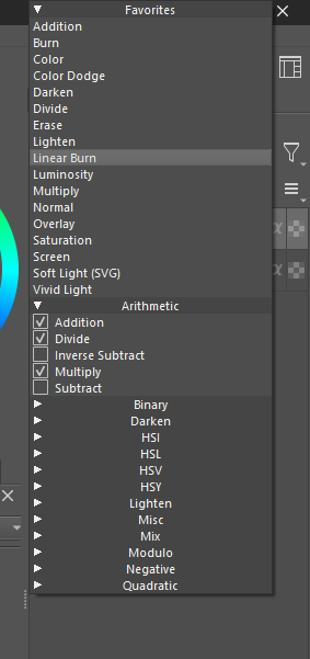 it sort the favorites in alphabetic order which dosen’t provide any useful case. Better would be to order it by common functionality or other types. For example multiply and darken makes white transparent so it makes sense to combine them in one section. lighten and screen makes black transparent. Overlay and soft light makes a 50% Grey Transparent, etc…