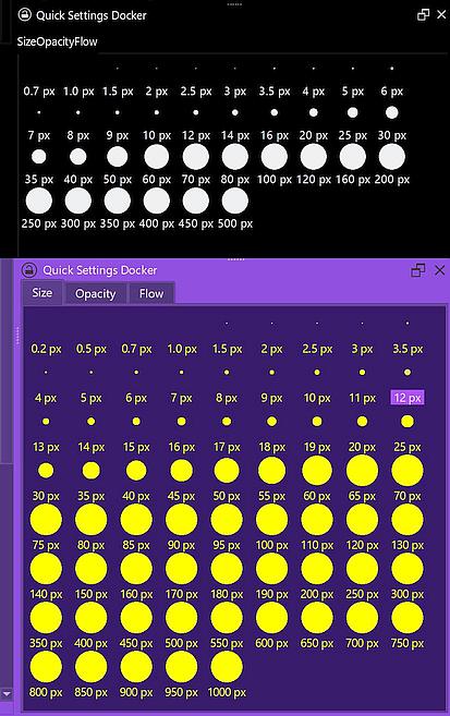 For a stroke holding its size constantly, you should use brushes that do not react to pressure or disable the pressure in that brush via Krita’s brush editor, that you can reach via F5 or a click on its toolbar-icon. This way you can set the wanted brush size/diameter and paint in that size. In combination with the Quick Settings Docker, you can access several brush sizes with a click. The Quick Settings Docker is found in Krita via ‘‘Settings’’ >> ‘‘Dockers’’, and you can even customize it if you are computer-savvy and have no fears when it comes to editing configuration files in folders Windows dislikes to see users in. ![]()