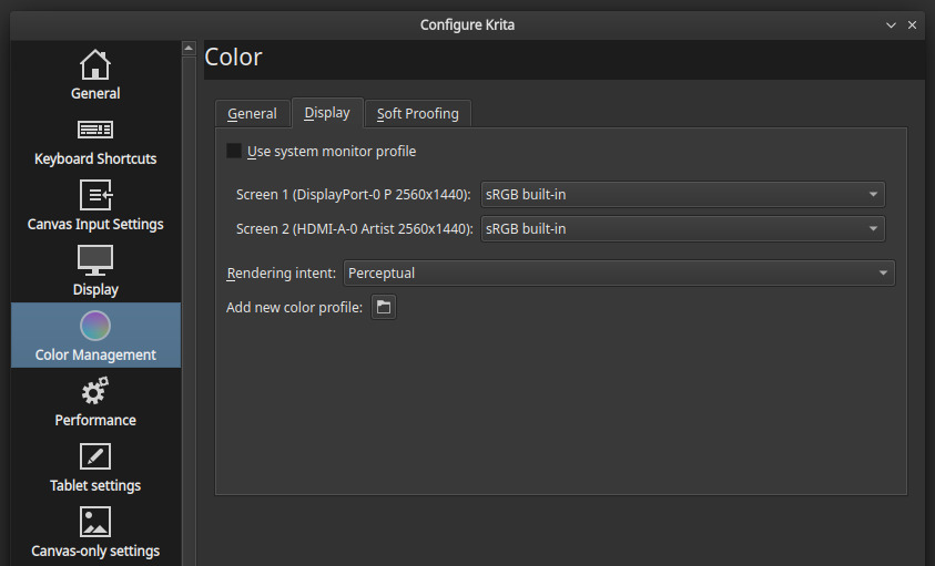 First, the simplier: for you to uncheck the “Use system monitor profile” option on Krita settings (under Color Management > Display) in case you just want your Krita canvas to follow the behavior where all data will expand to fully color volume of your monitor. But you need to know it is not accurate, and as soon someone with a color managed webbrowser will see your result, they’ll found the sRGB small/dull/greish representation.