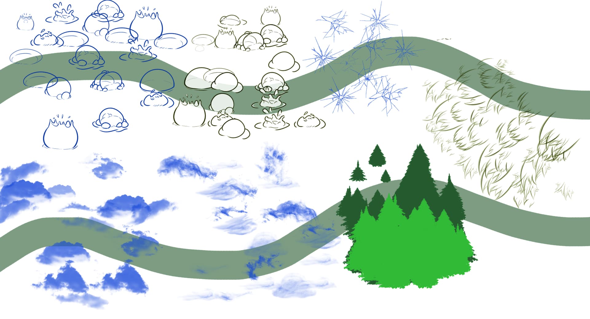 What kind of tools, brushes, techniques to use to get interesting effects like a cloudy sky, a green meadow, a forest and forest floor etc…