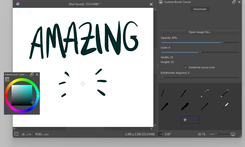 The only downside is that I have to re-Activate it every time I open Krita, select my custom cursor (at least it’s there along with the others and I don’t have to load it again) and make all the modifications I need.