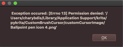 - when I start the program using “sudo open ./krita.app” (which I guess is starting the program with admin rights) I have the same problem, the Plugin runs but when I click on “Open image file…” it gives me a popup message “Exception occurred:…”