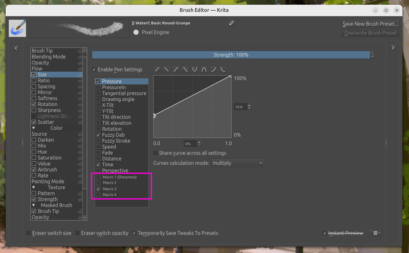 - A pencil-type preset might be given a macro called “Sharpness” that could be mapped to things like size, softness, texture, opacity, etc., to emulate how a pencil dynamics change as sharpness changes.