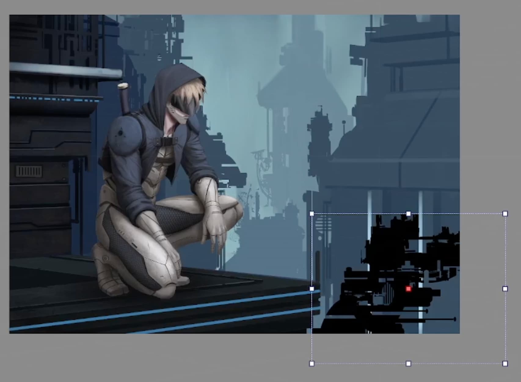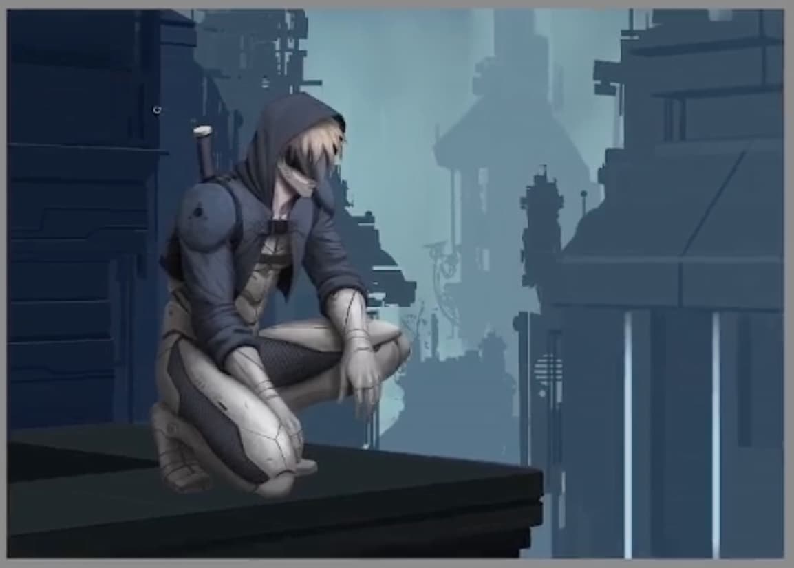 I really love cyberpunk mood. To create the city I used the new vector libraries (the latest video on Youtube). Their silhouettes gave the buildings interest, while generating new shapes to play with.