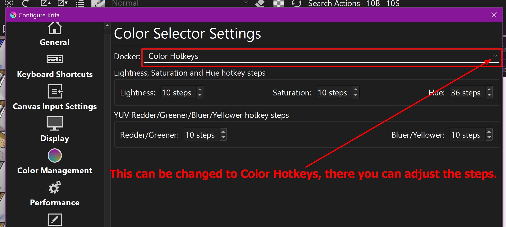 AHH, found it: In Krita under ââSettingsââ >> ââConfigure Kritaââ >> ââColor Selector Settingsââ select as Docker (that is the topmost entry on that page) ââColor Hotkeysââ >> and there you can adjust the steps your Hotkeys should have.