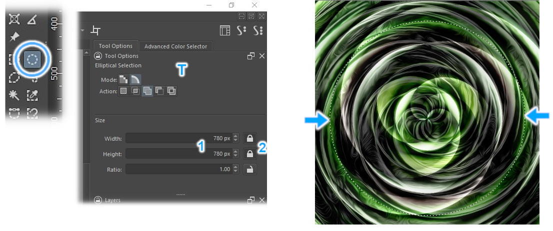 In the Toolbox, take the Elliptical Selection Tool (blue circle). In “Tool Options” (T), choose equal values for “Width” and “Height” (1) and click on the padlock icons (2), to get a perfect circle. When you click on the image, the circle will be created: just drag it to the center of the image.