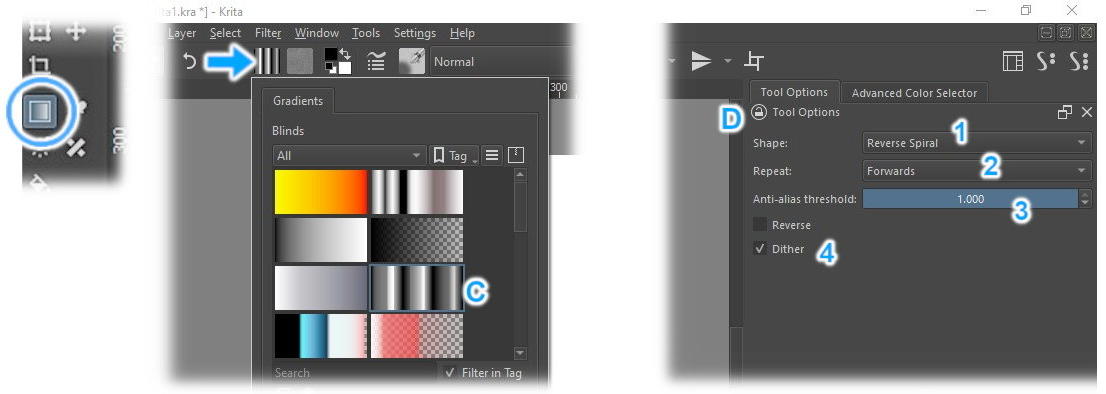Let´s go! In the toolbox, select the Gradient Tool (blue circle). In the top bar, click the gradient button (indicated by the blue arrow) and from the list choose the Blinds gradient (C). Go on the right side of the your screen, in “Tool Options” (D). In “Shape”, select "Reverse Spiral" (1) and in "Repeat:", choose: “Forwards” (2) and leave the rest as shown in the image (3 and 4). (Thank you, Ahab and Sooz!