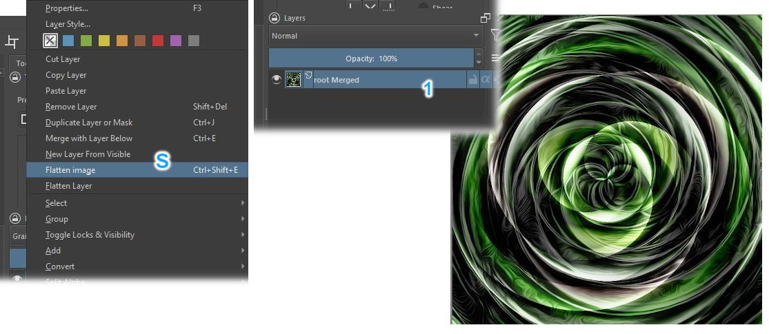 Then right-click on the top layer and choose: "Flatten Image" (S). Our image will revert to having only one layer, as in the beginning (1). Now, we will use a selection tool to separate the central region…
